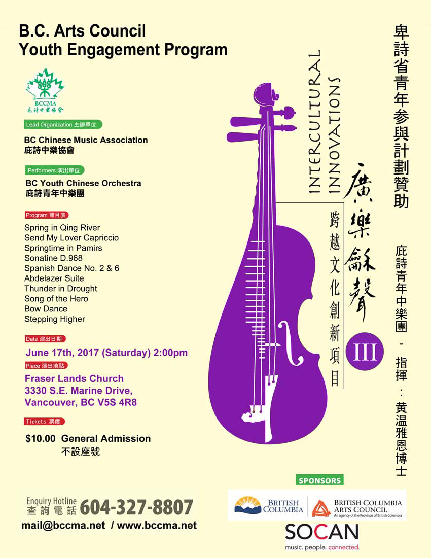 The Intercultural Innovations III concert will be held on June 17, 2017 2:00pm at the Fraser Lands Church (3330 S.E. Marine Drive, Vancouver, BC).