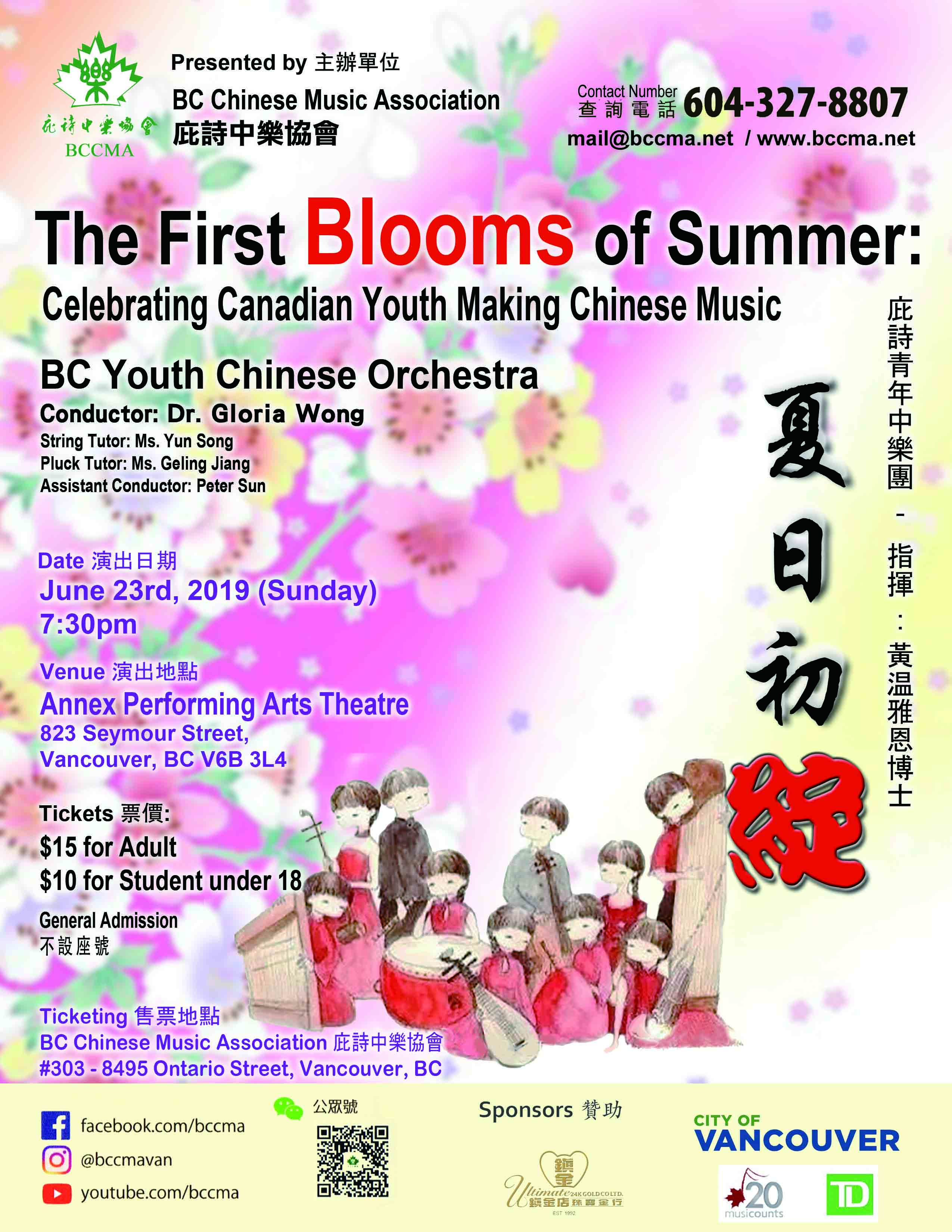 The B.C. Youth Chinese Orchestra would like to present to you, The First Blooms of Summer: Celebrating Canadian Youth Making Chinese Music. The B.C. Youth Chinese Orchestra is celebrating its 18th season with an evening of traditional Chinese orchestral pieces and solo performances from talented young musicians playing the erhu, pipa, yangqin, and zheng.