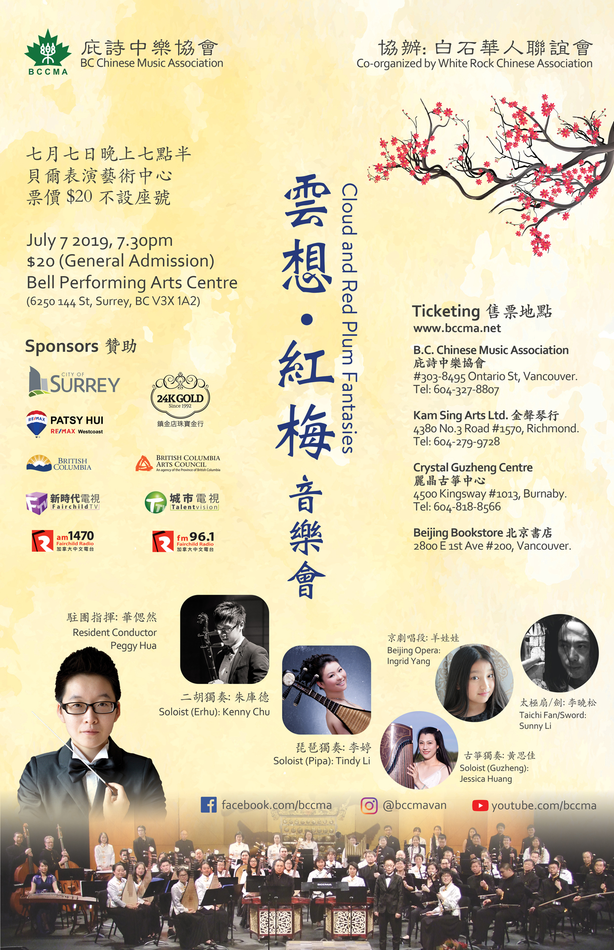 In May and July of 2019, BCCO will showcase two concerts in Vancouver and Surrey. Cloud and Red Plum Fantasies will be hosted at the Bell Performing Arts Centre on Sunday July 7th. Under the direction of Resident Conductor Ms. Peggy Hua, more than 60 members will perform a wide-variety of repertoire on Chinese traditional instruments. Furthermore, we’ve invited local art groups to perform with us, including guzheng, Peking Opera, and Taichi sword. The concert features two visiting musicians, Jessica Huang and Ingrid Yang, as well as Taichi fan/sword performer Sunny Li.