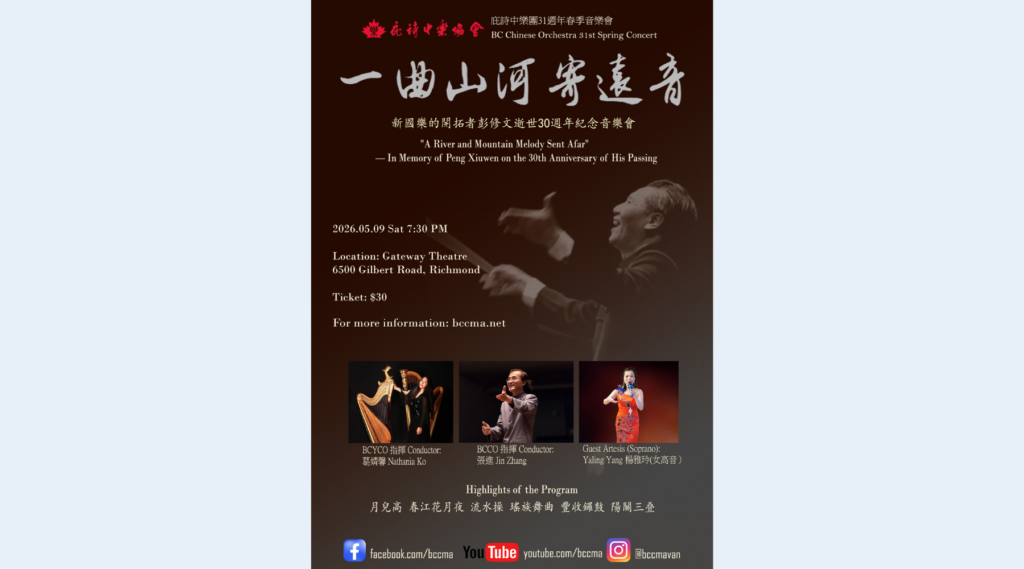 Beyond the full orchestral showcase, the concert highlights the depth and breadth of cultural succession. The BC Youth Chinese Orchestra (BCYCO), led by conductor Nathania Ko, will perform the evocative Moonlight on Spring River, demonstrating the younger generation’s mastery and interpretation of traditional heritage. Additionally, the BC Chinese Chamber Ensemble will present Autumn Song & Summer Night Themes, arranged by Jin Zhang, showcasing the delicate textures and innovative spirit of the plucked-string section. This commemorative event is more than an artistic feast; it is a vital initiative for cultural preservation and community engagement. By revisiting these masterpieces, we aim to deepen our community’s appreciation for Chinese music and fulfill our shared vision of cultural continuity.
